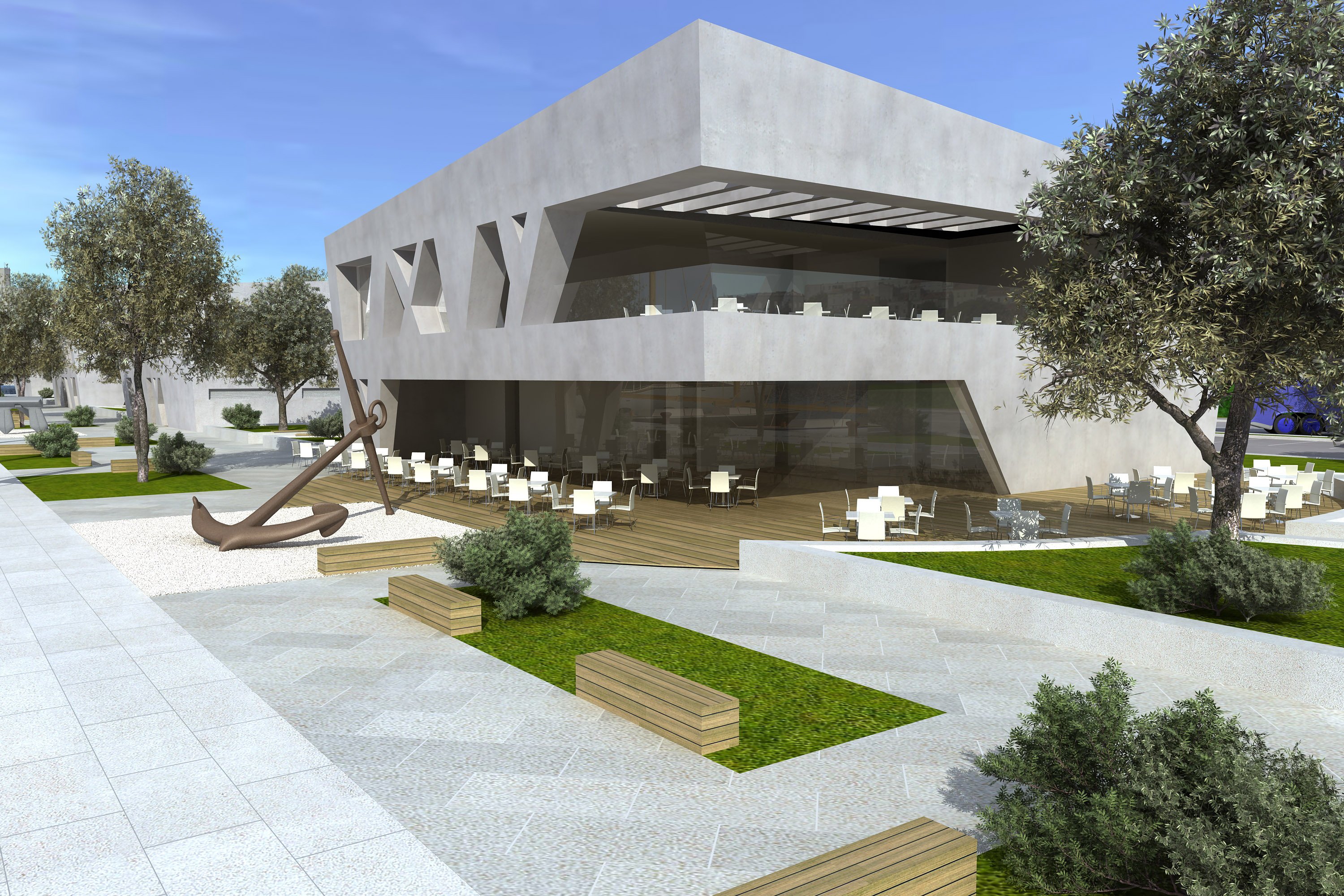 Zgrada 1 u završnoj je fazi radova. Građevina je projektirana kao ugostiteljski objekt sa dvije poslovne jedinice. Na katu se nalazi lokal tipa restoran za pružanje usluga prehrane i pića sa konzumnim unutarnjim prostorom i natkrivenom terasom, pripadajućim sanitarijama za korisnike, garderobama i pripremnicama. U prizemlju se nalazi lokal tipa caffe bar. U sklopu objekta su predviđeni i tehnički prostori prizemlju.